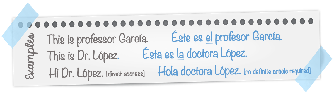 The article is used before most personal titles when talking about people, but not when talking to them. El señor Smith está en casa. (Mr. Smith is at home.) But, hola, señor Smith (hello, Mr. Smith ). La doctora Jones asistió a la escuela. (Dr. Jones attended the school.) But, doctora Jones, ¿como está? (Dr. Jones, how are you?)