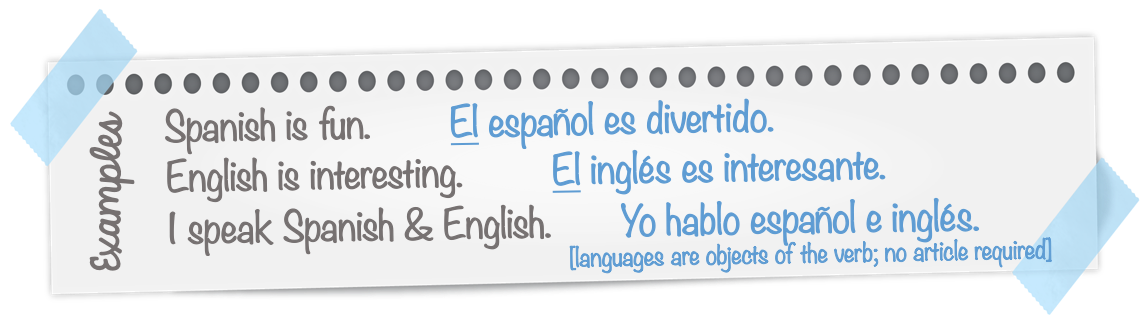Spanish is fun. El español es divertido. / English is interesting. El inglés es interesante; I speak Spanish. Yo hablo españo [none needed when the language is the object of the sentence].